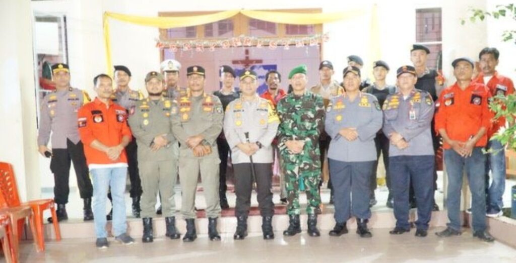 ROHUL, Tepakonline.com– Untuk memastikan Jema’at dapat tenang dan nyaman dalam beribadat para Perayaan malam Natal Tahun 2023, Kapolres Rokan Hulu (Rohul) AKBP Budi Setiyono SIK MH bersama dengan Forkopimda giat pengamanan, Minggu (24/12/2023) sekitar pukul 18.30 Wib.