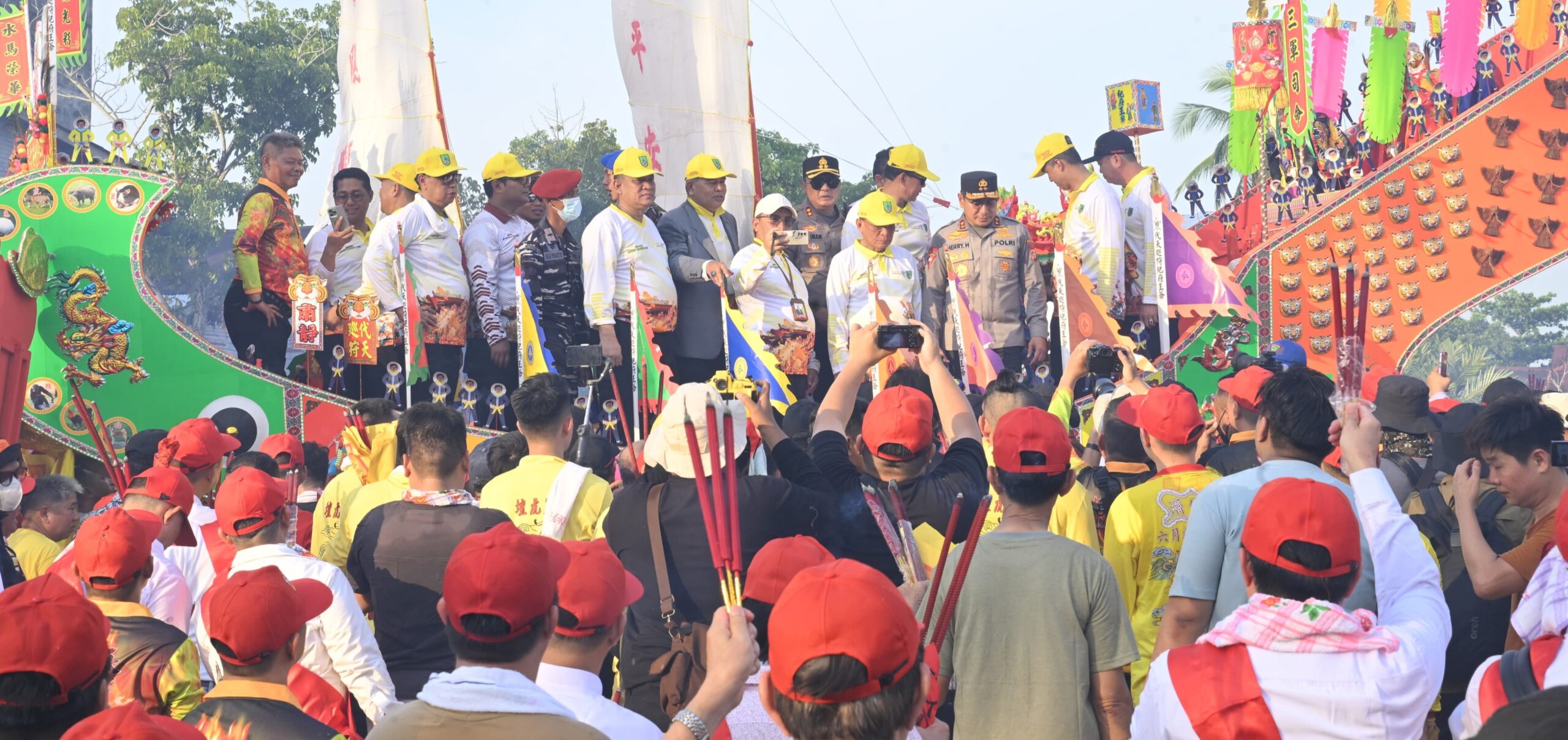 Replika tongkang sebuah perahu kayu simbolik yang dihiasi dengan ornamen merah dan kuning cerah sebagai lambang keberanian dan kemakmuran diarak secara massal menuju lokasi pembakaran. Prosesi ini dipimpin oleh puluhan pria berpakaian seragam kuning, disambut antusiasme ribuan warga yang memadati sepanjang rute arak-arakan.