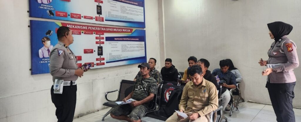Sembari melaksanakan tugas sehari- hari yakni pelayanan kepada pemohon pengurusan Bpkb, petugas juga berperan aktif menggelorakan Pemilu Damai 2024 kepada pemohon yang sedang antri untuk pengurusan Bpkb,