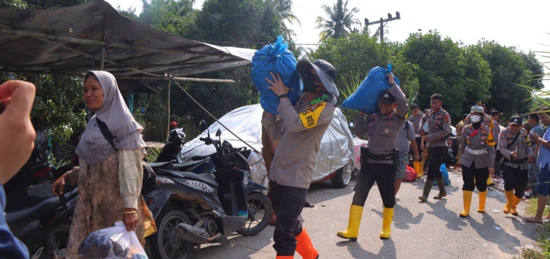 Kapolres Rohil AKBP Andrian Pramudianto, turun langsung ke lokasi banjir. Ia ikut membantu evakuasi dan mengangkat barang milik korban banjir untuk dibawa ke tenda pengumgsian.