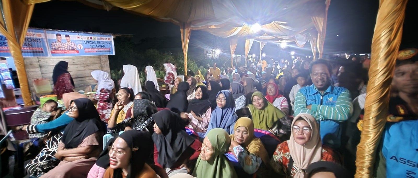 Tepakonline.com, ROHIL- Meski dalam kondisi banjir, ratusan masyarakat jalan sempurna, Kepenghuluan Bagan Jawa, kecamatan bangko tetap semangat menghadiri kampanye dialogis pasangan Afrizal Sintong – Setiawan (Asset) nomor urut 01, Kamis (17/10/2024) malam.