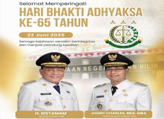 Tepakonline.com, ROHIL- Pemerintah Kabupaten Rokan Hilir (Pemkab Rohil) menyampaikan ucapan selamat memperingati Hari Bhakti Adhyaksa ke-65 yang diperingati pada Selasa, (23/7/2025). Ucapan tersebut disampaikan Bupati H. Bistamam bersama Wakil Bupati Jhonny Charles.