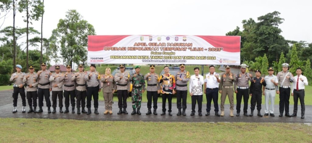 TELUK KUANTAN, Tepakonline.com- Dalam Rangka Pengamanan Natal Tahun 2023 dan Tahun Baru 2024, Polres Kuansing gelar Apel Gelar Pasukan Operasi Lilin Lancang Kuning Tahun 2023.