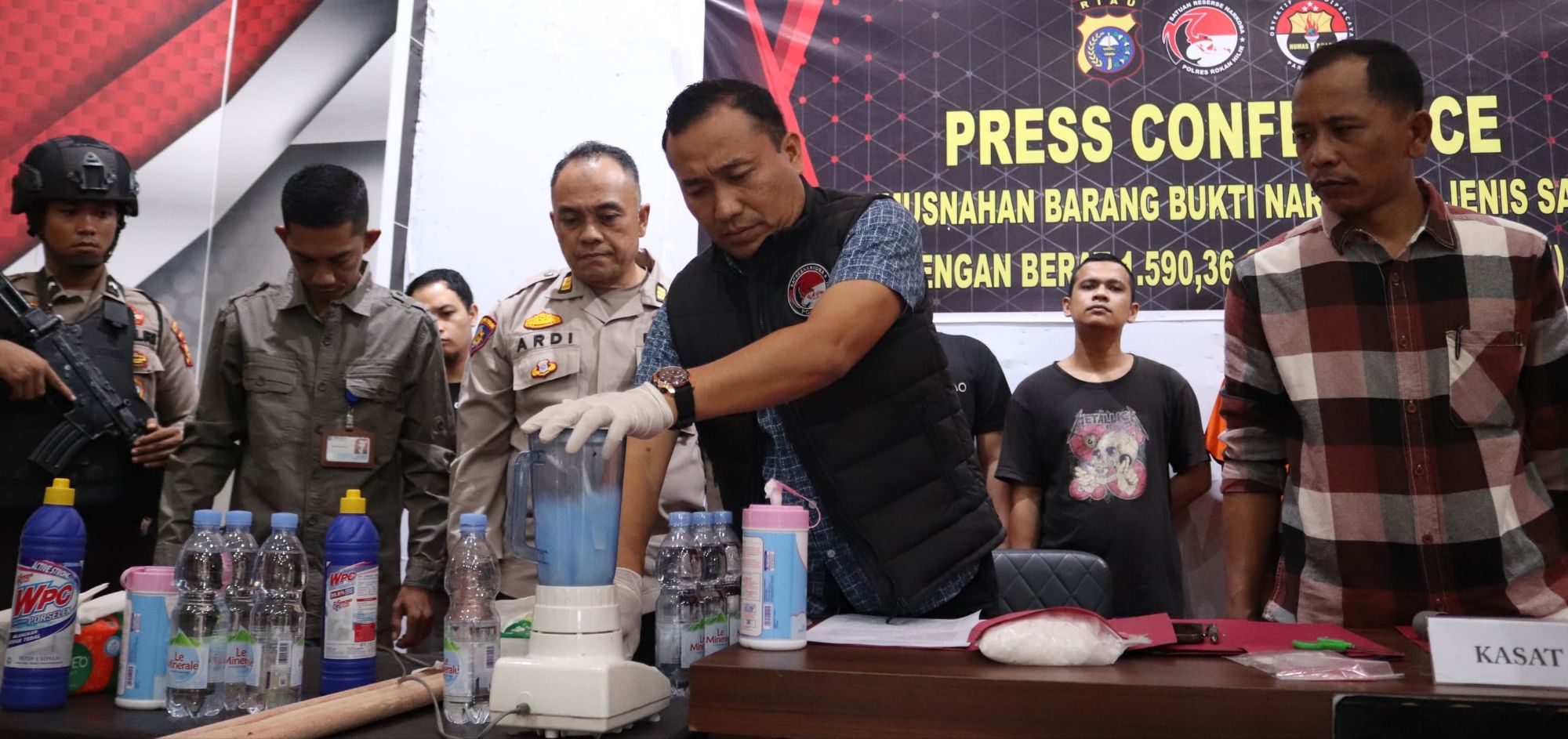 Dihadapan Penasehat Hukum Muhammad S.H dan Para Awak Media Kabupaten Rokan Hilir. Press Conference di Aula Tunggal Panaluan Polres Rokan Hilir ini adalah berupa pemusnahan barang bukti Narkotika jenis Sabu dari pengungkapan 4 Kasus yang melibatkan sebanyak 8 Tersangka di tempat berbeda di wilayah hukum Polres Rohil.