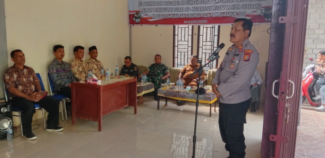 KUANSING, Tepakonline.com- Dalam Rangka Cooling System Pemilu Damai 2024, Polsek Kuantan Hilir hadiri Pelantikan Pengawas Tempat Pemungutan Suara ( PTPS ) Pemilu 2024 Se – Kecamatan Kuantan Hilir Seberang Kabupaten Kuansing.