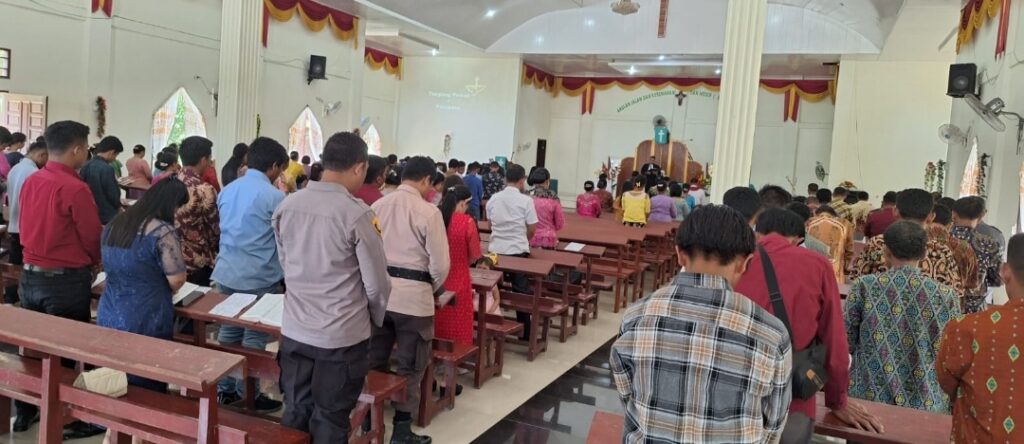ROHIL, Tepakonline.com- Kepolisian Resort (Polres) Rokan Hilir ( Rohil) Polda Riau, melalui Polsek Rimba Melintang melaksanakan kegiatan pesan pemilu dengan penuh suasana damai di Gereja HKBP Poros Jalan H. Annas Maamun Kelurahan Rimba Melintang Kecamatan Rimba Melintang Kabupaten Rokan Hilir. Minggu 17 Desember 2023. Pukul 09.00 WIB.
