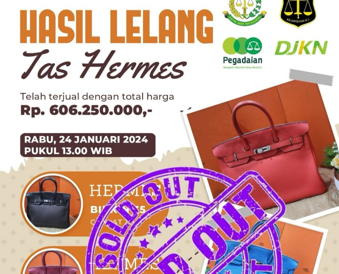 JAKARTA, Tepakonline.com– Melalui laman web lelang.go.id, Pusat Pemulihan Aset Kejaksaan Agung berhasik melelang barang sita eksekusi berupa 6 buah tas bermerek Hermes milik Istri Terpidana BENNY TJOKROSAPUTRO. Rabu 24/01/2024.