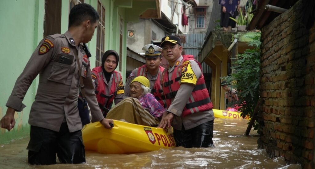 Terlihat Kapolres AKBP Budi bersama Personilnya, ikut melakukan evakuasi Warga, khususnya Lanjut Usia (Lansia), terkurung Banjir Setinggi antara 60 sampai 90 Centi Meter dengan mendorong Perahu Karet ke lokasi aman.