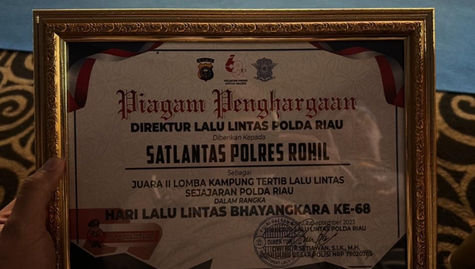 ROHIL- Satlantas Polres Rohil terima penghargaan dari Direktur Lalu Lintas Polda Riau juara II Kampung Tertib Lalu Lintas se Jajaran Polda Riau dalam rangka Hari Lalu Lintas Bhayangkara ke 68 beberapa hari yang lalu. Kamis 28/09/2023.