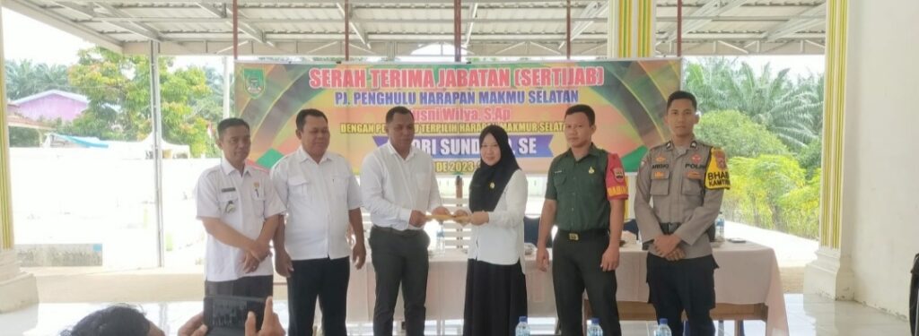 ROHIL- Serah Terima Jabatan dari Pj Datin Penghulu Harapan Makmur Selatan ke Penghulu terpilih Andri Sundoko SE di halaman Desa Harapan Makmur Selatan Kecamatan Basira, Rabu 22/11/2023 Pukul 14.00 Wib.