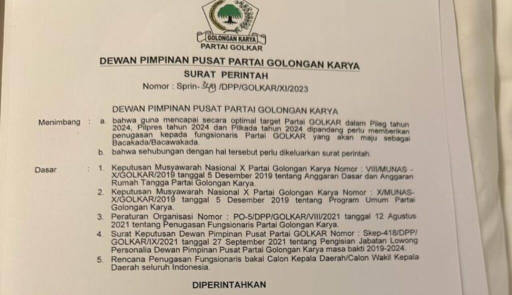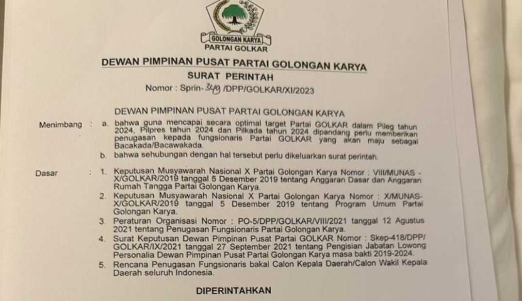 Surat perintah tersebut ditandatangani langsung ketua umum partai Golkar Airlangga Hartarto dan Sekjen Lodewijk F Paulus pertanggal 20 November 2023 dengan Nomor Sprint; 349/DPP/Golkar/X/2023.