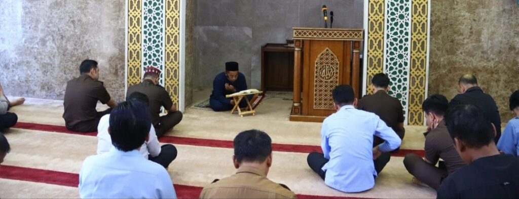 Kegiatan Tausiyah Dzuhur di Masjid Al-Mizan Kejaksaan Tinggi Riau mengikuti secara ketat protokol kesehatan (prokes).