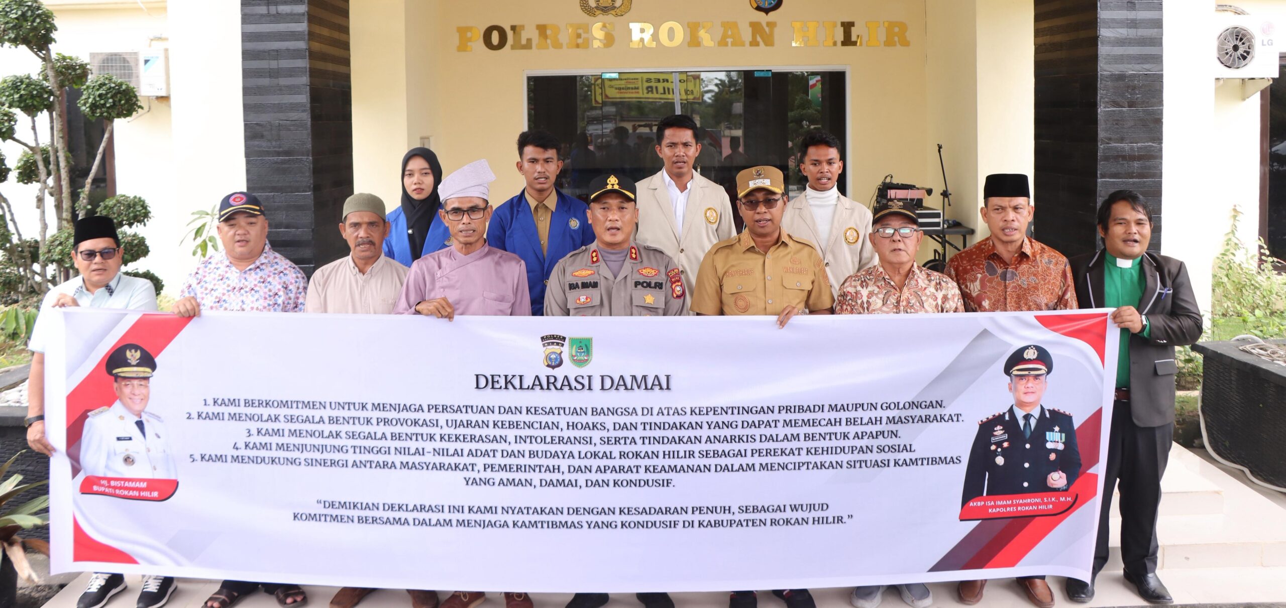 Tepakonline.com, ROHIL- Polres Rokan Hilir bersama Forkopimda, tokoh adat, tokoh agama, pemuda, mahasiswa, serta perwakilan masyarakat menggelar Deklarasi Damai dalam rangka menjaga keamanan dan ketertiban di Kabupaten Rokan Hilir, Senin (01/09/2025).